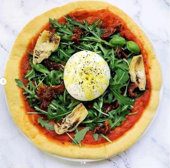 Prendre de la salade roquette, de l’origan séché, des artichauts marinés, des tomates séchées, une burrata, du poivre et une bonne huile d’olive extravierge.